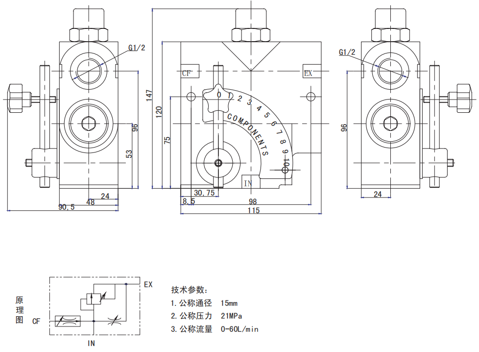 LKF全范圍壓力補償可變流量控制閥。經(jīng)過精心設(shè)計,它的節(jié)流口面積會隨著閥桿的旋轉(zhuǎn)而變化。不論CF油口EX油口的壓力如何變化,控制油口的流量始終是平穩(wěn)恒定的。它擁有一個可調(diào)節(jié)的彈簧安全閥使壓力可以上升到設(shè)置的安全壓力。安全閥的壓力出廠設(shè)置是1500psi可調(diào)節(jié)范圍是750-3000psi。